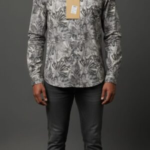 The collar is a standard point, and the shirt is styled with the sleeves cuffed halfway up the forearm.
